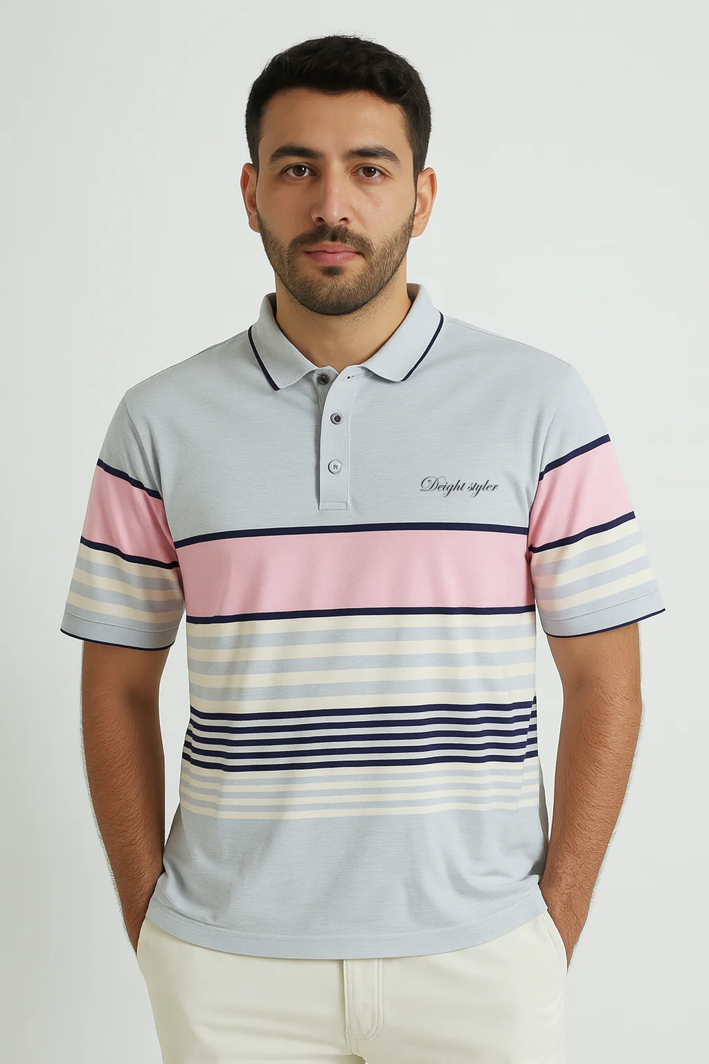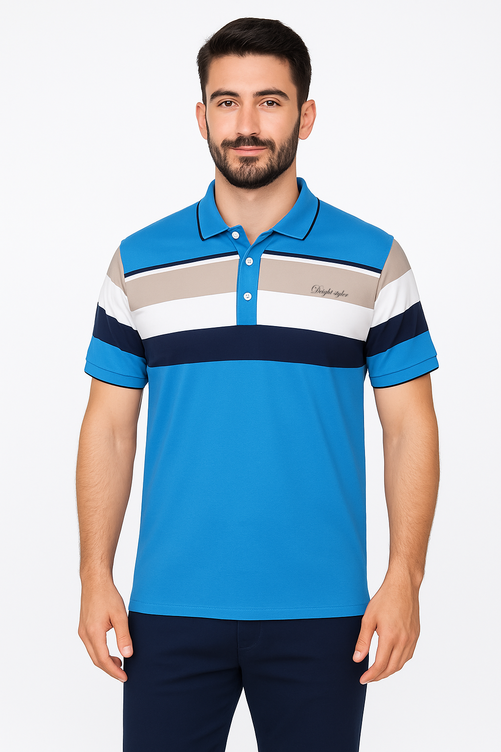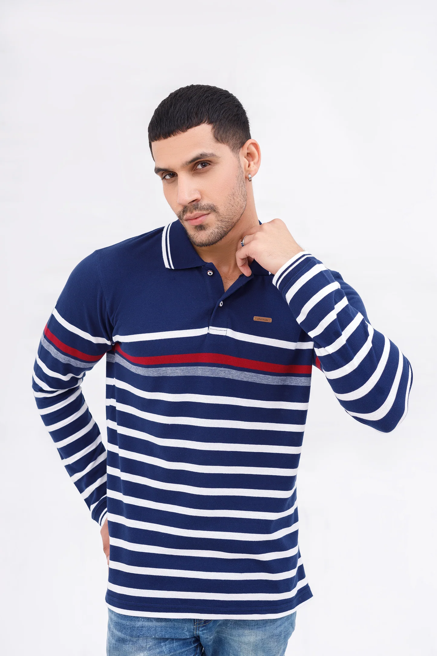بولو رجالي بأكمام طويلة – مخطط أبيض/كحلي